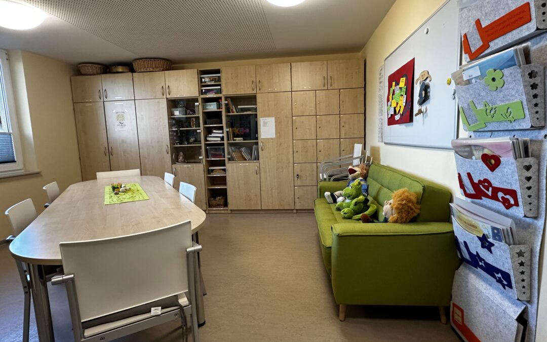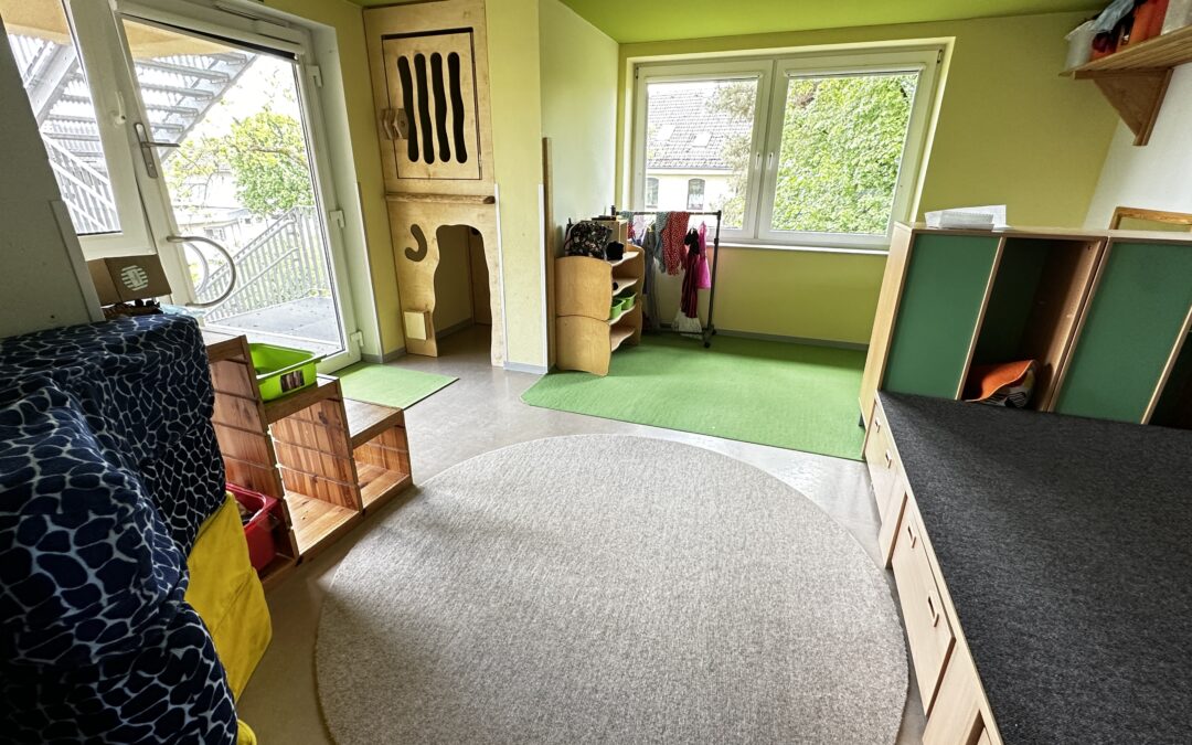 Die Gruppenräume sind wie ein Appartement angelegt mit Garderobe, Wasch-, Schlaf-, und Materialraum. Das Außengelände mit Spielmöglichkeiten ist teilweise von den Gruppen aus direkt zugänglich.